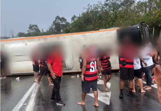 Imagens de uma câmera de monitoramento registraram o momento em que o veículo perde o controle e tomba na pista. O ônibus havia saído do Rio de Janeiro e seguia com destino à Argentina, onde o Flamengo enfrenta o Racing nesta quarta-feira (29), pelo jogo de volta da Copa Libertadores da América.