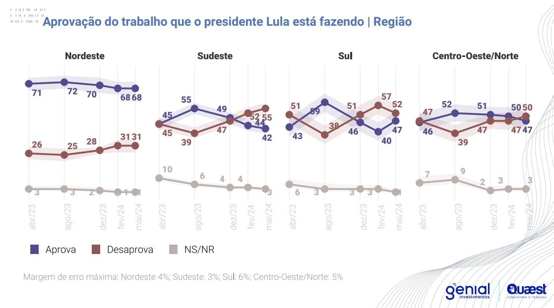 No Sudeste, a aprovação continua oscilando negativamente (caindo), e chegou a 42%. A taxa de desaprovação nessa região registrou alta – saindo de 52% em fev/2024 para 55% em mai/24.