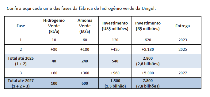 A fábrica de hidrogênio da Unigel terá investimentos em três fases. Na primeira etapa do projeto, já em construção, a empresa está investindo US$ 120 milhões e contará com a tecnologia de eletrólise de alta eficiência da alemã thyssenkrupp nucera.