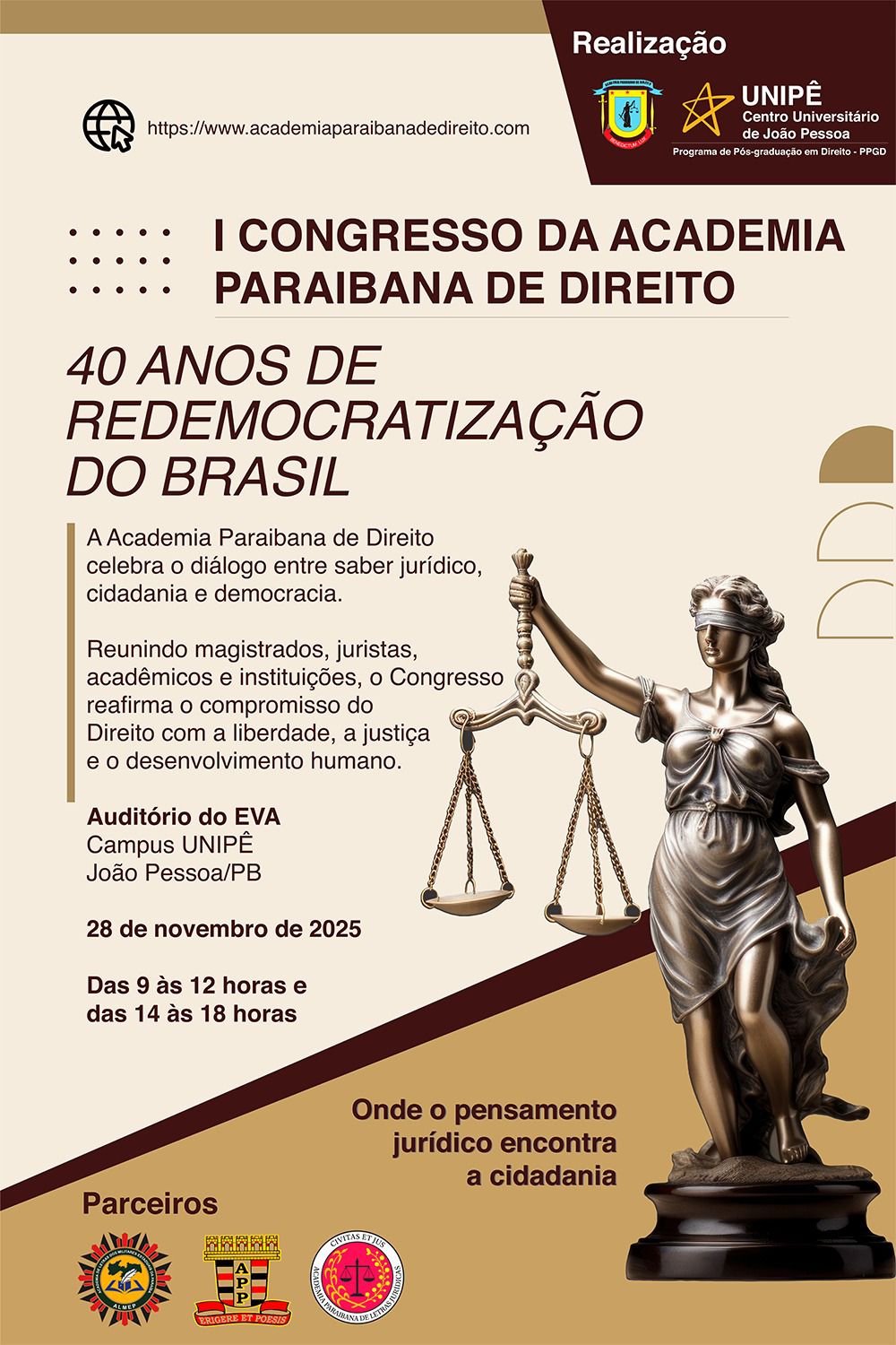 O Brasil completa, em 2025, 40 anos de redemocratização, marco que redefiniu a vida institucional do país e abriu caminho para a Constituição de 1988, os direitos civis e a retomada das liberdades públicas. Para discutir esse percurso histórico e os desafios que permanecem, a Academia Paraibana de Direito (APD) realiza, no dia 28 de novembro, o I Congresso da Academia Paraibana de Direito – 40 anos de Redemocratização do Brasil.