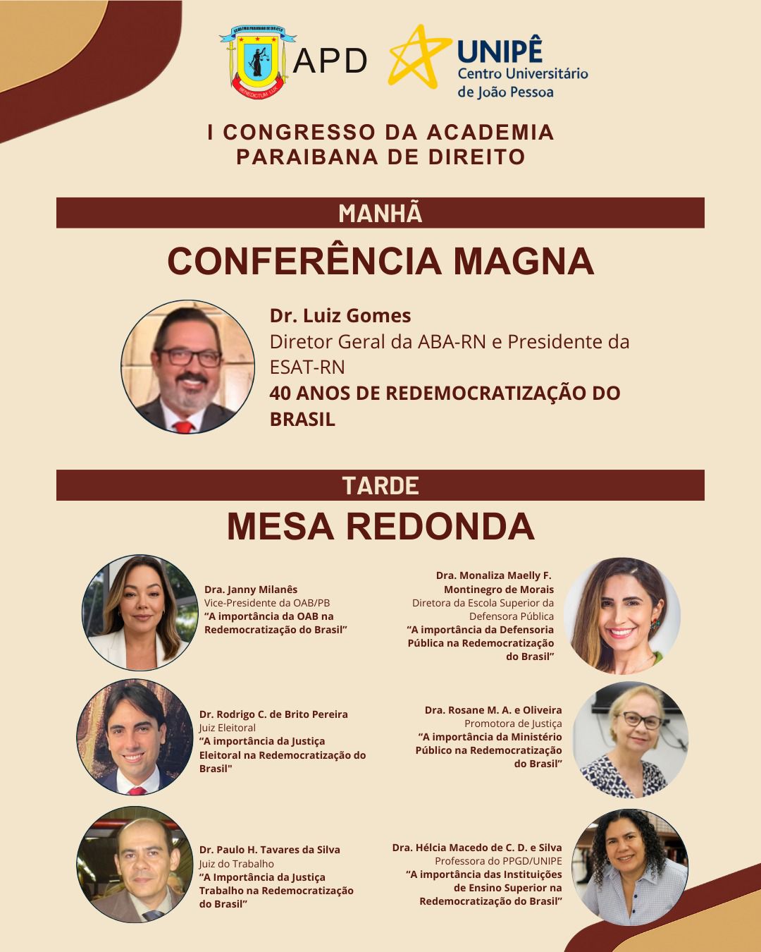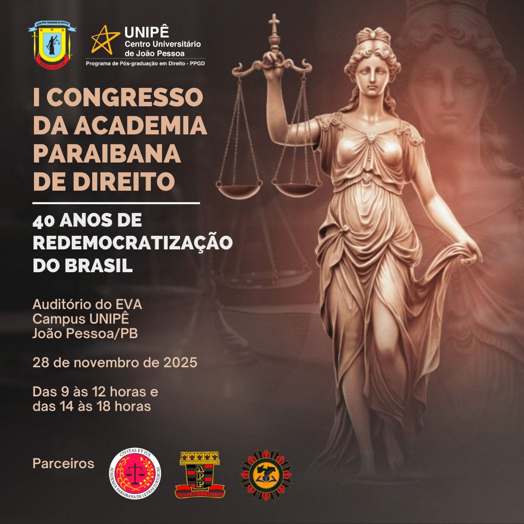 Às vésperas de sua realização, o I Congresso da Academia Paraibana de Direito (APD) reforça o convite ao público jurídico e acadêmico para um dia de debates sobre os 40 anos de redemocratização do Brasil, no próximo 28 de novembro, no Auditório do EVA, no UNIPÊ, com programação gratuita nos turnos da manhã e tarde.