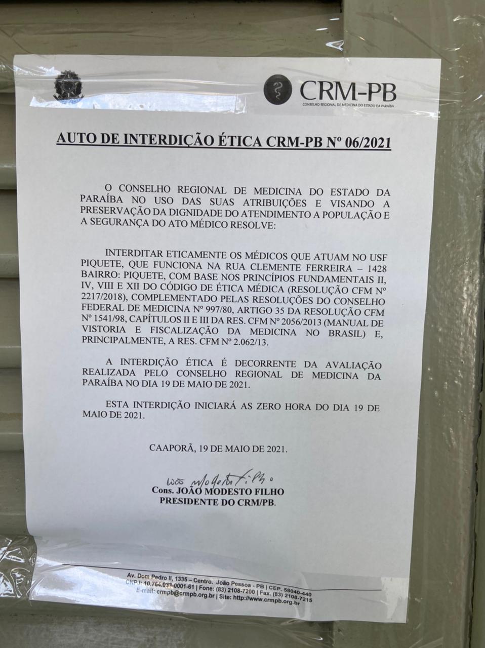 A interdição ética do CRM-PB já está em vigor e proíbe que os médicos prestem seus serviços no local, até que se tenha condições de oferecer uma assistência adequada à população e se tenha segurança para o ato médico, diz o conselho.