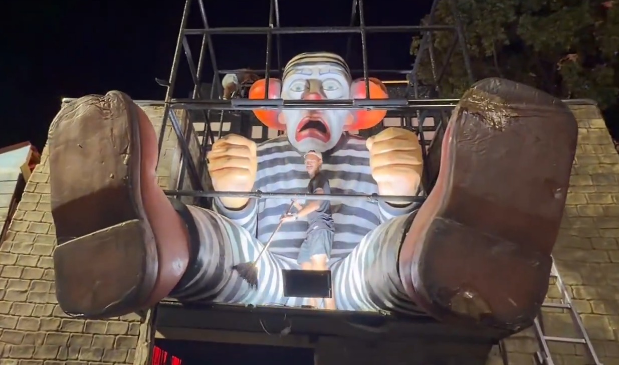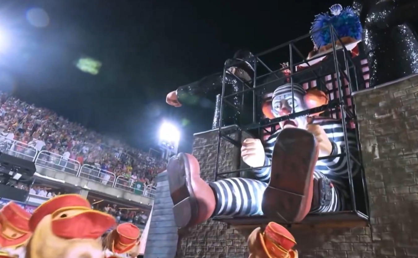 Ainda durante o desfile, foi exibido um palhaço gigante vestido como prisioneiro, com uma tornozeleira eletrônica danificada, em referência a um episódio envolvendo Bolsonaro, no qual ele usou um ferro de solda para danificar o equipamento.