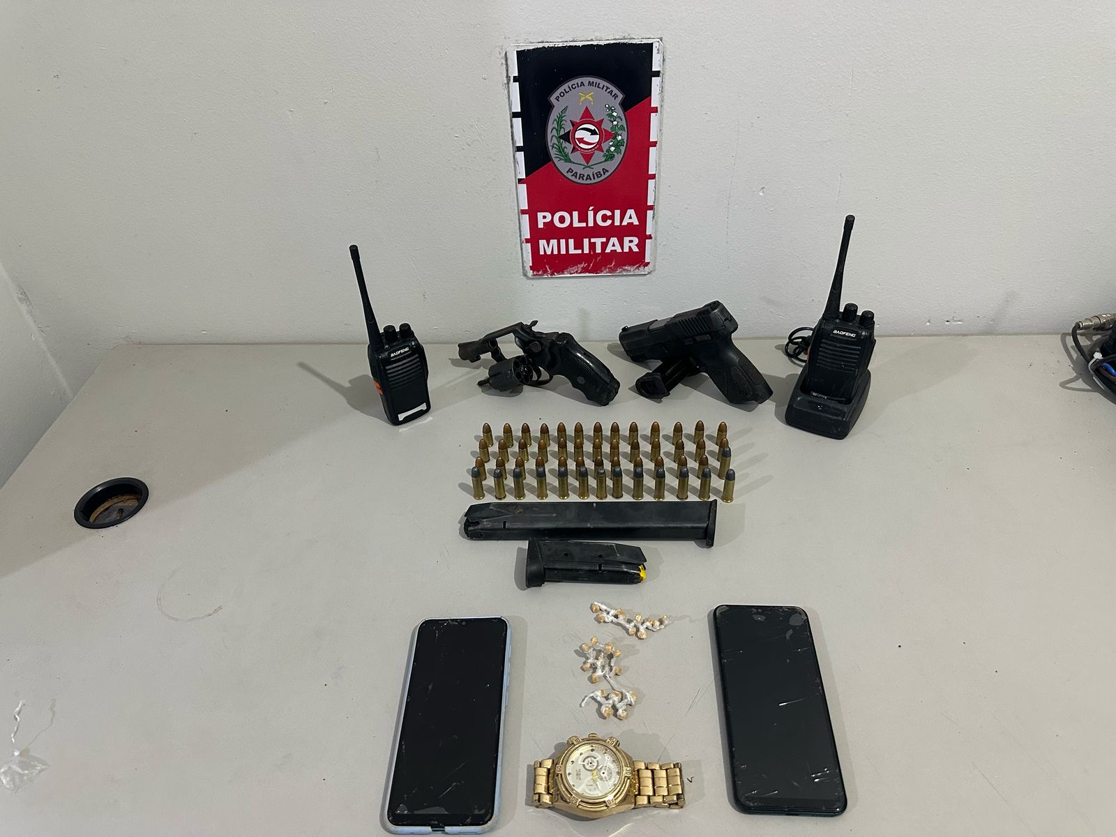 Durante a abordagem, foram apreendidos dois rádios comunicadores, duas armas, munições, drogas e celulares. Além do relógio roubado do policial.