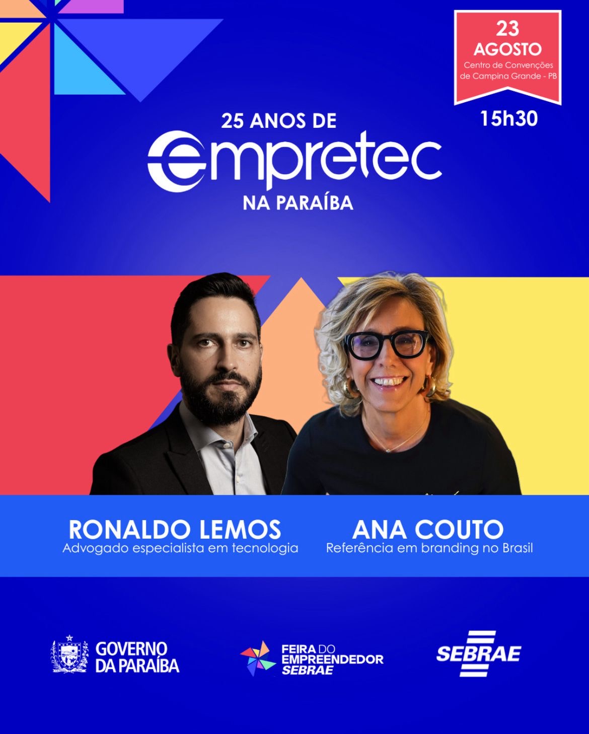 O Empretec está completando 25 anos na Paraíba e, para celebrar esse ciclo de sucesso, o Sebrae preparou uma programação especial durante a Feira do Empreendedor. No dia 23, às 15h30, haverá uma palestra de Ana Couto, referência em branding no Brasil e Ronaldo Lemos, advogado especialista em tecnologia, em comemoração à trajetória de sucesso da iniciativa do Sebrae no estado. Ana há 30 anos auxilia marcas a encontrarem valor e propósito. Já Ronaldo, por sua vez, tem em seu currículo a idealização do Marco Civil da Internet, a atuação como colunista na Folha de São Paulo e a direção do Instituto de Tecnologia e Sociedade do Rio. A inscrição no evento é gratuita, pelo site: https://feiradoempreendedorpb.com.br/.