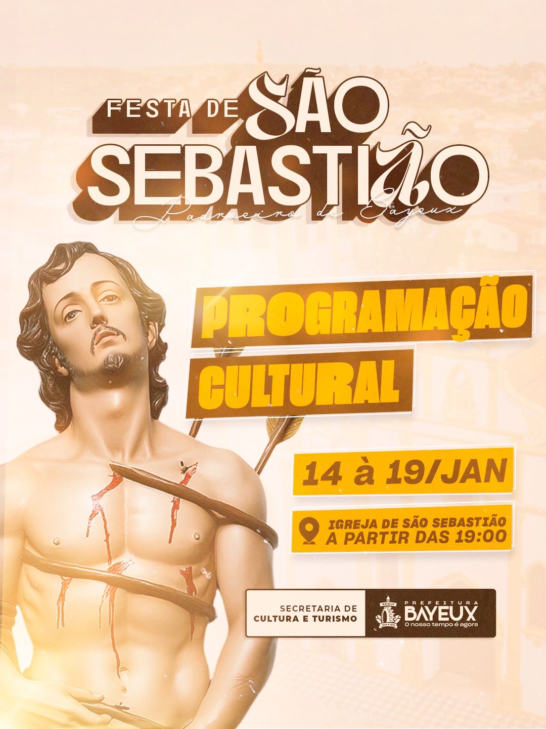 A festa em homenagem a São Sebastião, padroeiro de Bayeux, começa, oficialmente, nesta quarta-feira (14). O evento contará com uma ampla programação cultural entre os dias 14 e 19 de janeiro, reunindo atividades religiosas, esportivas e apresentações musicais no município. O dia do padroeiro do município é 20 de janeiro.