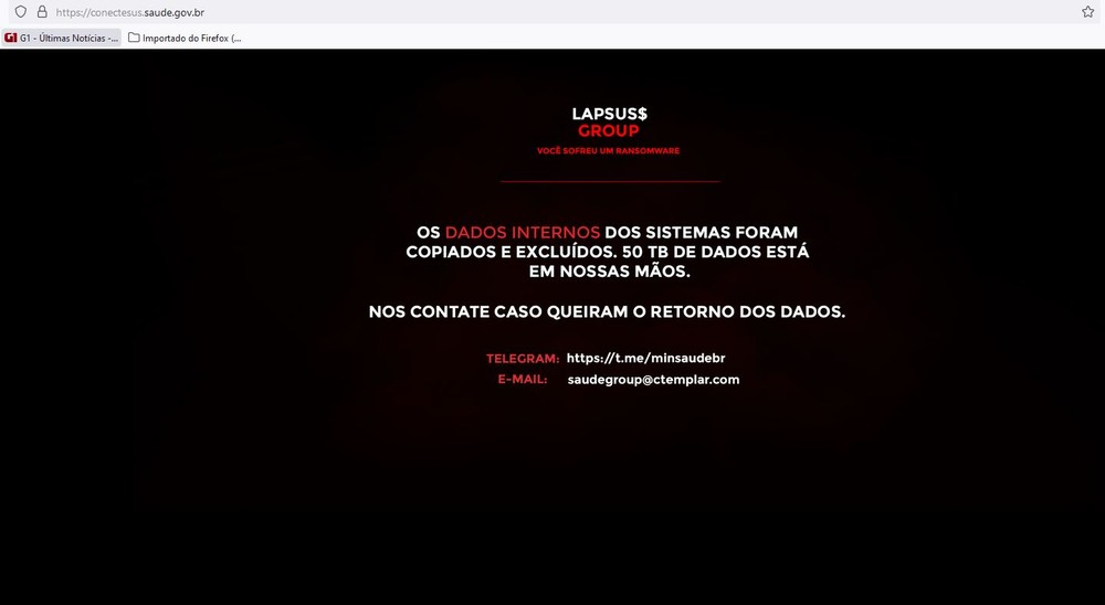 Os dados de vacinação contra a Covid-19 sumiram. O “Lapsus$ Group” assumiu a autoria do ataque cibernético. Na madrugada, os sites do Ministério da Saúde e do ConecteSUS tinham a mensagem “nos contate caso queiram o retorno dos dados”. (Veja nas imagens abaixo). Mais tarde, as mensagens sumiram, mas as páginas seguem fora do ar.