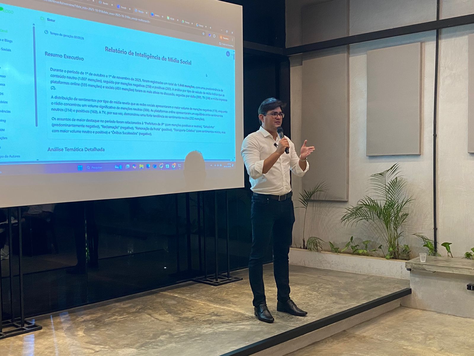 Durante o evento, Humberto abriu a conta de um cliente, o SINTUR-JP, e mostrou o funcionamento da plataforma. Os números apontam o total de menções ao cliente por período, origem das menções, índice de reputação, entre outras métricas.