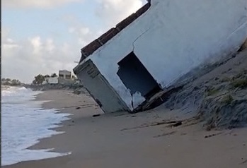Em Baía da Traição, na Paraíba, o avanço do mar resultou na perda de 80 metros de território e na destruição de casas, incluindo uma que virou de ponta-cabeça.