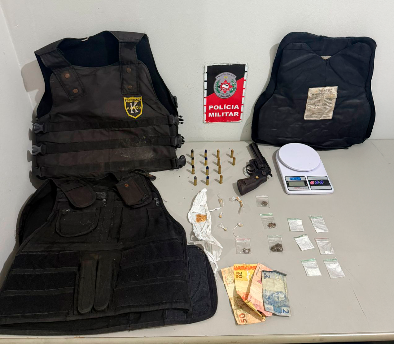 No local, foram apreendidos 2 coletes balísticos, 1 revólver calibre 38, munições, crack, cocaína e maconha. Além de balança de precisão e dinheiro em espécie.