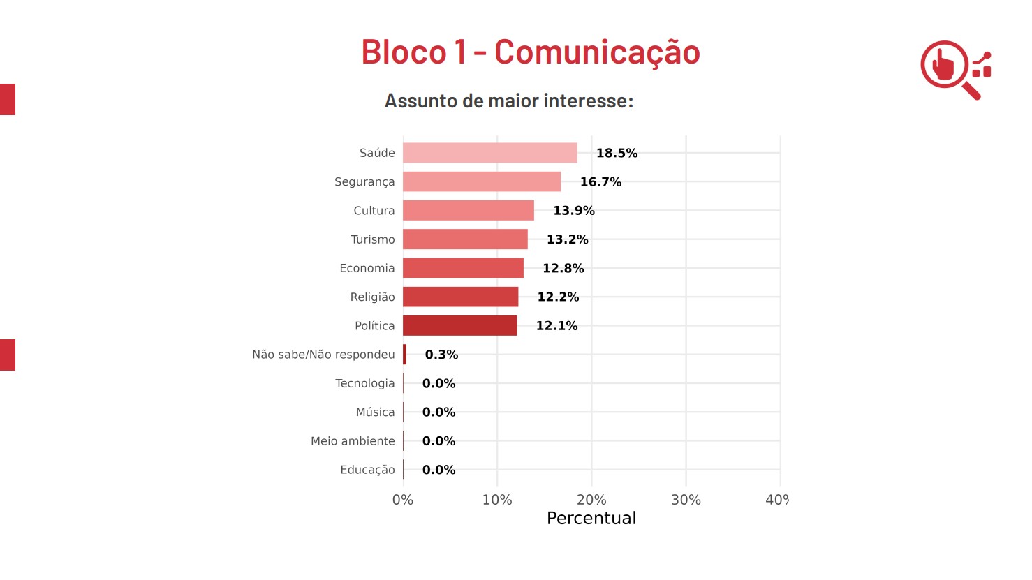 O estudo também indica que saúde e segurança pública lideram os temas de maior interesse da população local, seguidos por cultura e turismo, refletindo as principais preocupações dos moradores da cidade.
