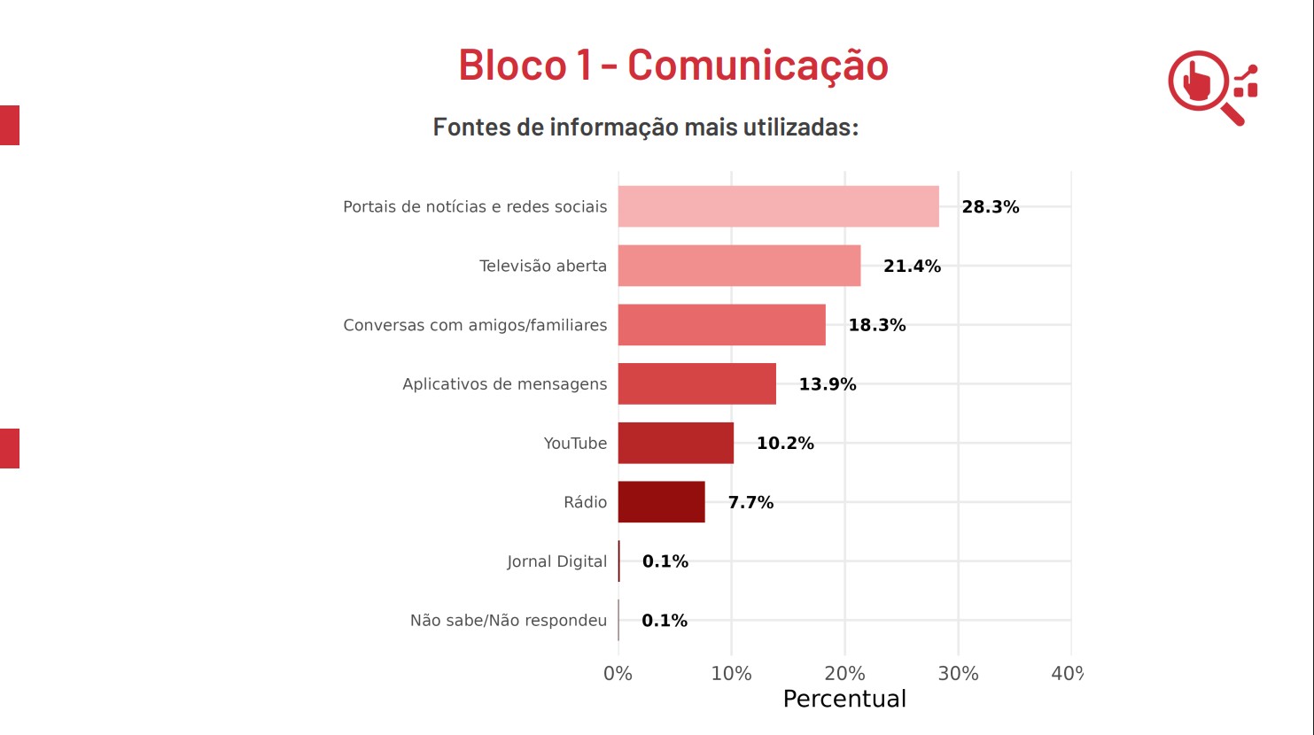 De acordo com o levantamento, 28,3% dos entrevistados afirmaram se informar principalmente por portais de notícia e redes sociais. A televisão aberta aparece em segundo lugar, citada por 21,4% dos consultados.