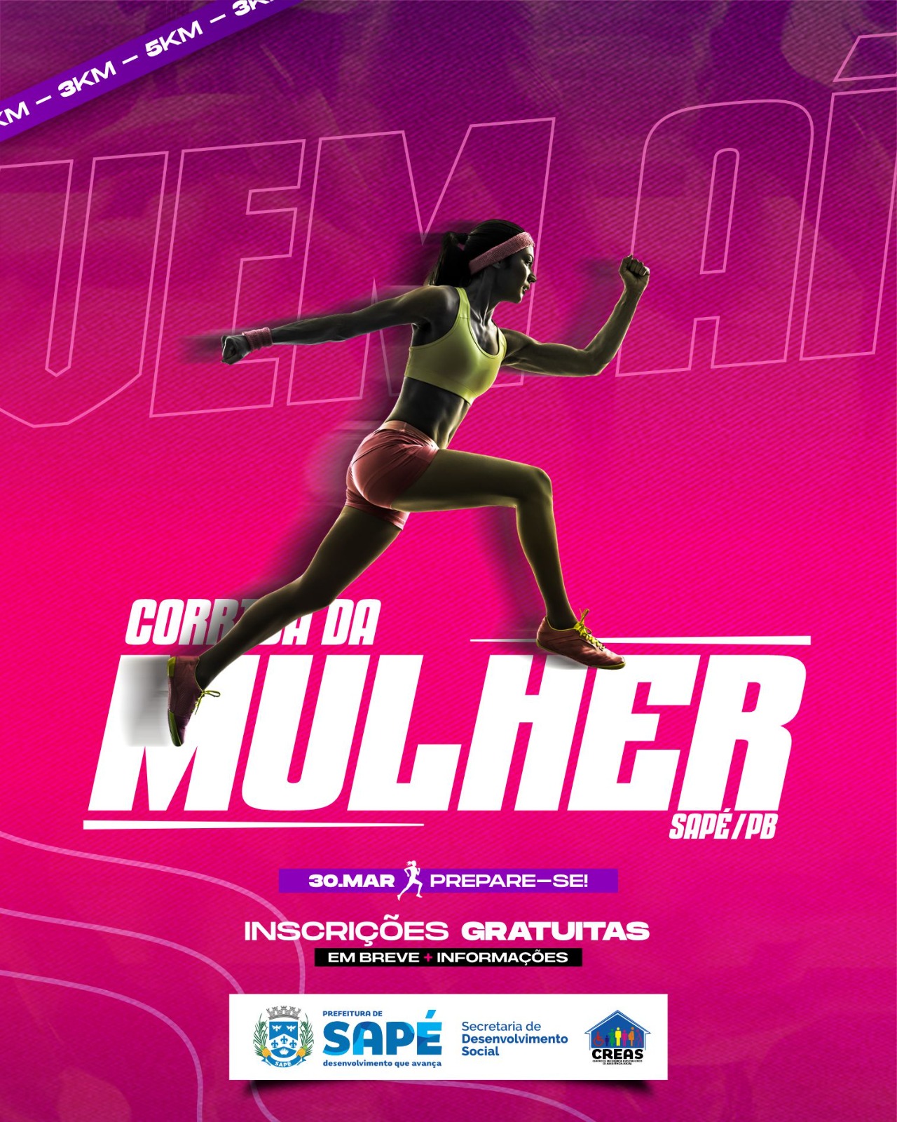A Prefeitura de Sapé realiza, no próximo domingo (30), a I Corrida da Mulher, evento coordenado pela Secretaria de Desenvolvimento Social (Sedes) e parte do calendário de atividades voltadas para o Mês da Mulher. O ponto de encontro será na Praça de Eventos, a partir das 5h.