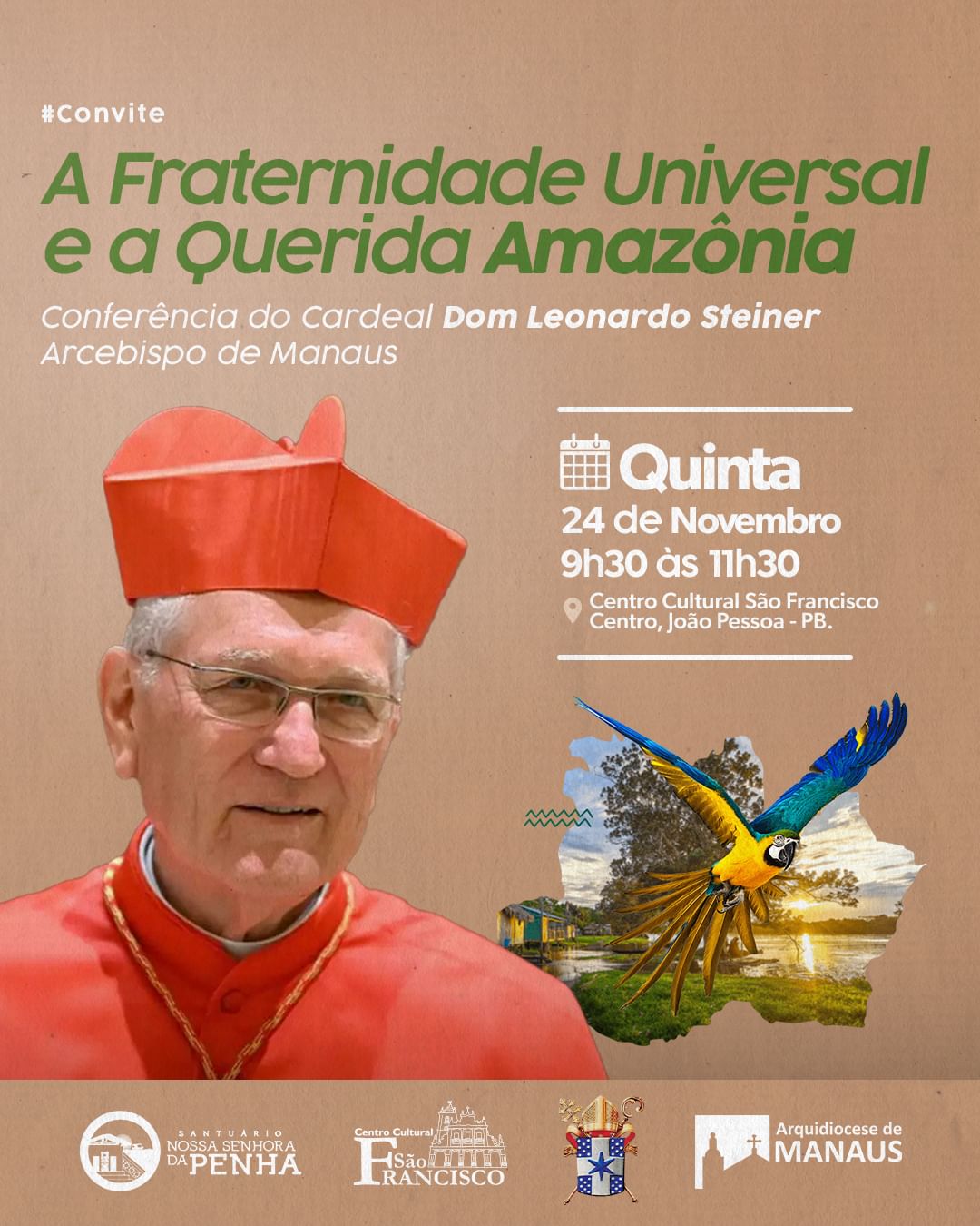 O arcebispo de Manaus, Dom Leonardo Steiner apresenta nesta quinta-feira (24), em João Pessoa, conferência sobre a “Fraternidade Universal e a Querida Amazônia”. O evento acontece das 9h30 às 11h30, no Centro Cultural São Francisco, oportunidade em que o líder religioso trará as reflexões do Papa Francisco sobre o meio ambiente e a Amazônia brasileira.