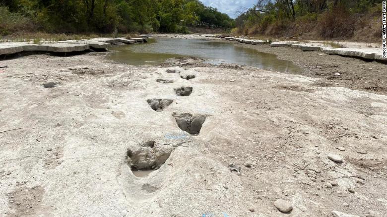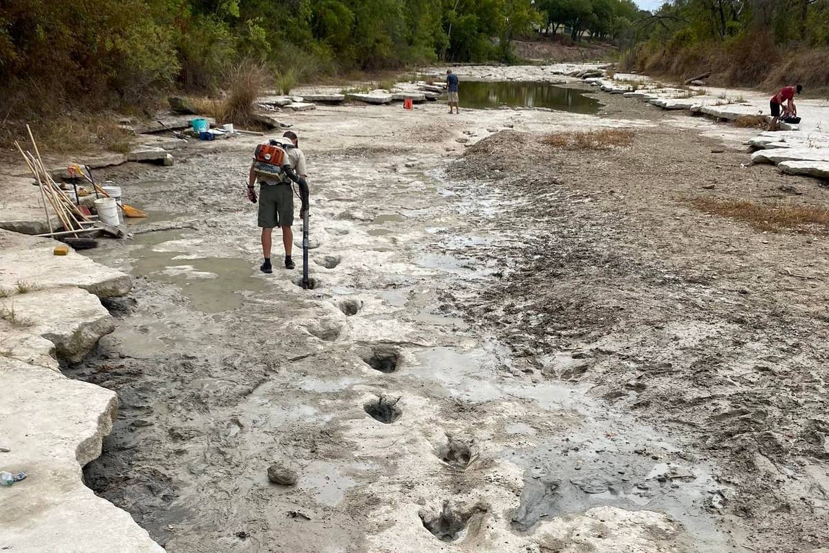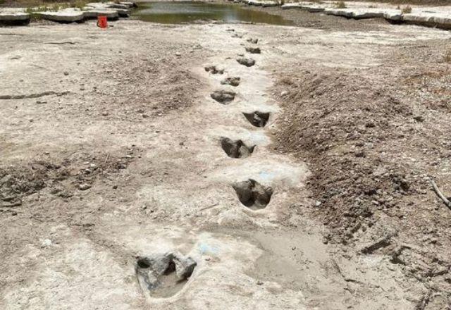 Pegadas de répteis que viveram há pelo menos 113 milhões de anos ficaram visíveis após uma grave estiagem no Texas, Sul dos Estados Unidos, baixar o nível de um rio que corta o parque estadual do Vale dos Dinossauros.