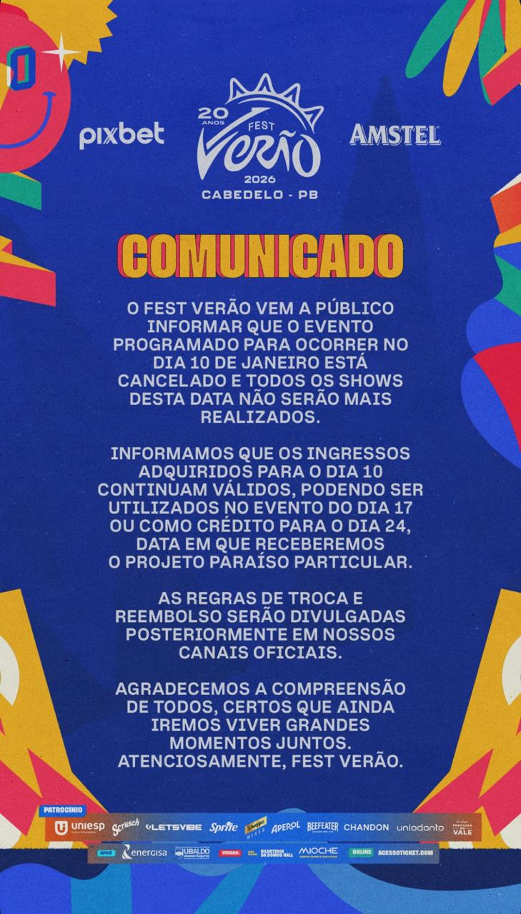 As regras detalhadas para troca e reembolso serão divulgadas em breve, exclusivamente por meio dos canais oficiais do Fest Verão Paraíba.
