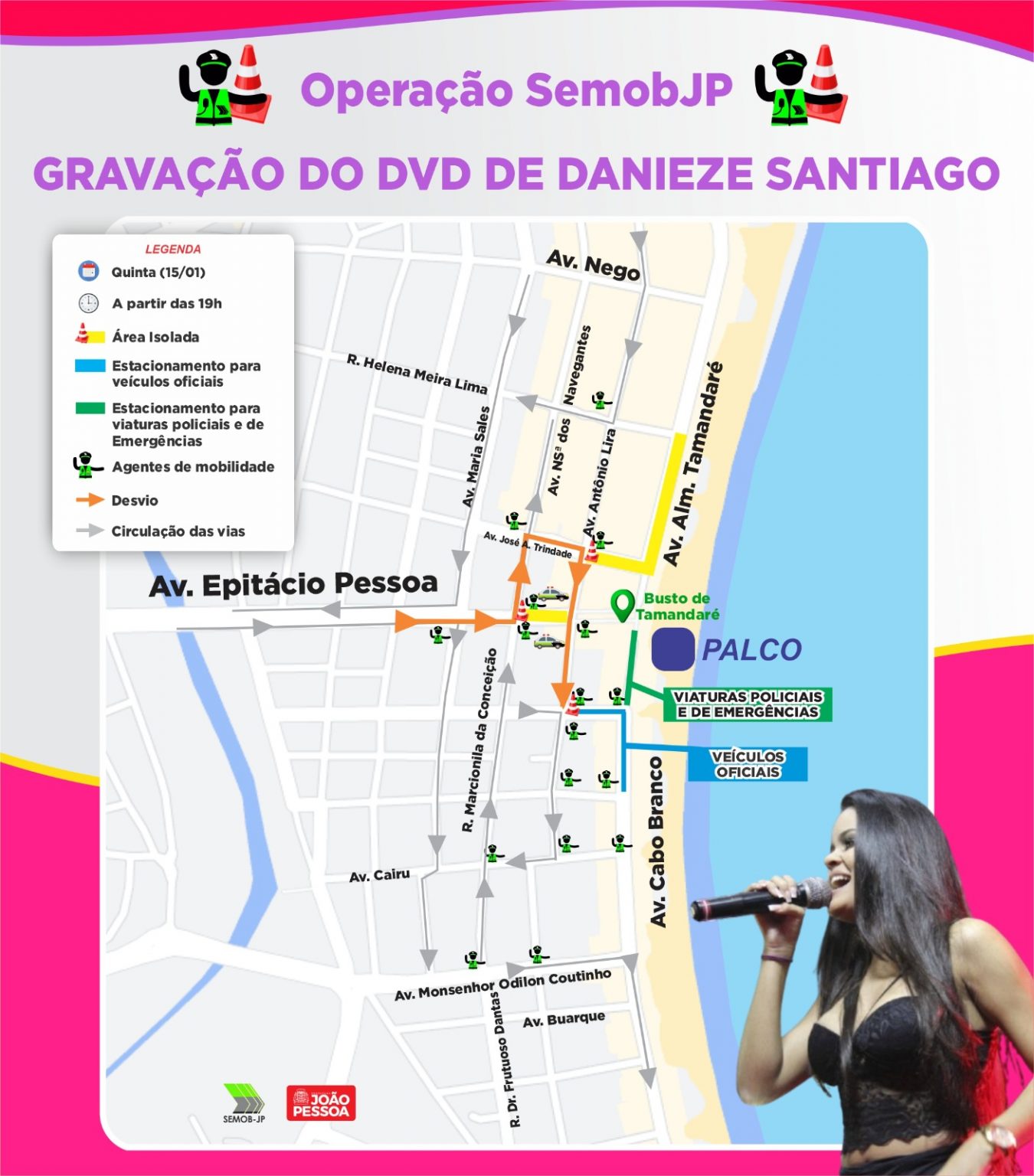 A Superintendência Executiva de Mobilidade Urbana de João Pessoa (Semob-JP) definiu o plano operacional de trânsito e transporte para a gravação do DVD da cantora Danieze Santiago, que será realizada na quinta-feira (15) no palco do Festival Forró Verão 2026, no Busto de Tamandaré, em Tambaú. A ação é destinada a garantir a fluidez do tráfego, a segurança dos pedestres e o transporte público eficiente para o grande público esperado.