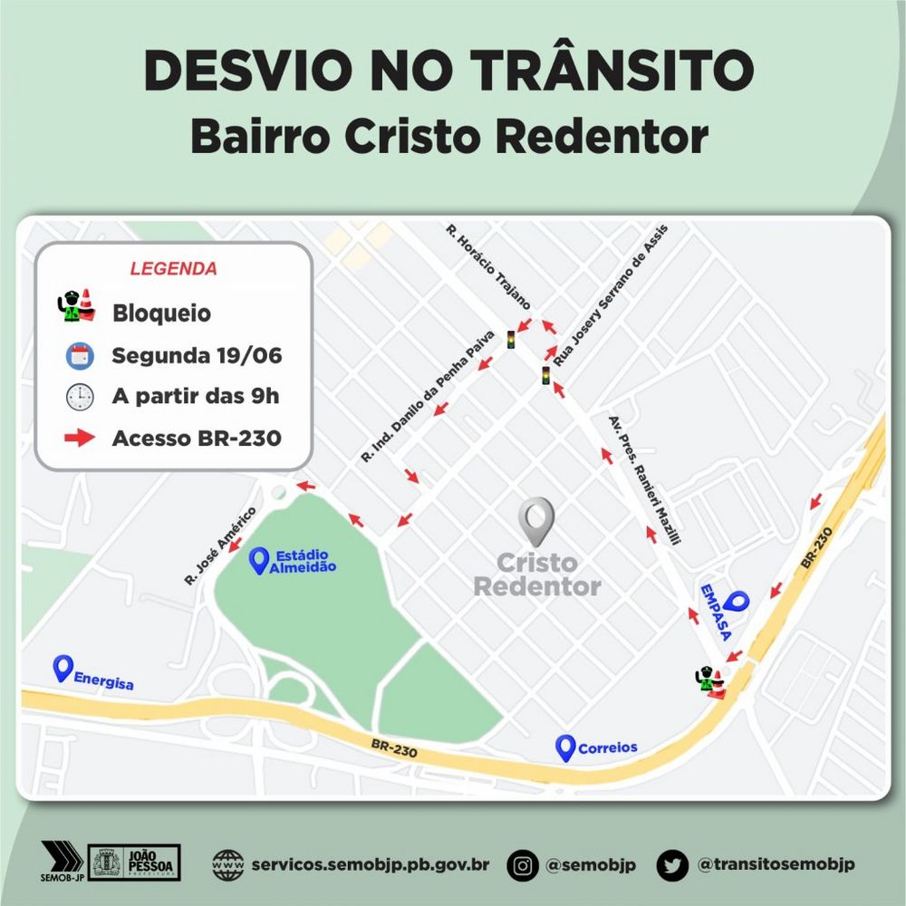 Agentes de mobilidade urbana devem ser designados para realizar o monitoramento do trânsito. Eles vão orientar os motoristas para seguir a rota de desvio. Na ocasião, todo o fluxo que vem da Rua Diógenes Chianca – na lateral da Empasa – com destino à BR-230, vai ser obrigado a entrar à direita na Rua Pres. Ranieri Mazilli, direita na Rua Josery Serrano de Assis, em seguida a Rua Horácio Trajano de Oliveira, novamente à esquerda Rua Industrial Danilo da Penha, cruza a Raniere Mazilii, segue à esquerda na Rua Professora Luiza Fernandes Vieira, à direita na Rua Desportista Napoleão Duré e segue a opção contornando o Estádio Almeidão acessando o Viaduto do Geisel, BR-230.