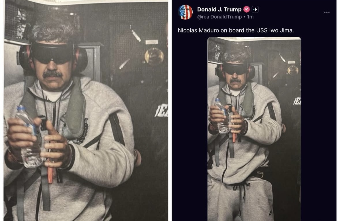Donald Trump divulgou uma imagem de Nicolás Maduro aparentemente algemado e vendado, a bordo do navio USS Iwo Jima, da Marinha dos Estados Unidos. A divulgação ocorreu após a captura do presidente venezuelano na madrugada de sábado para domingo.