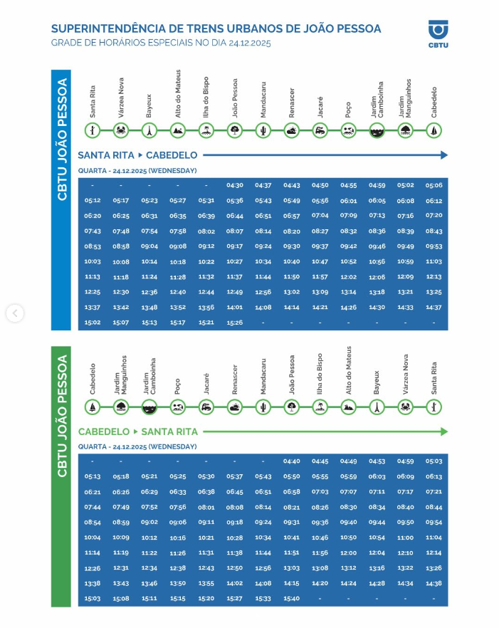 De acordo com a Companhia Brasileira de Trens Urbanos (CBTU), os trens funcionarão das 4h30 até as 15h40, encerrando a operação na Estação João Pessoa. Já no dia de Natal, 25, os trens não irão trafegar.